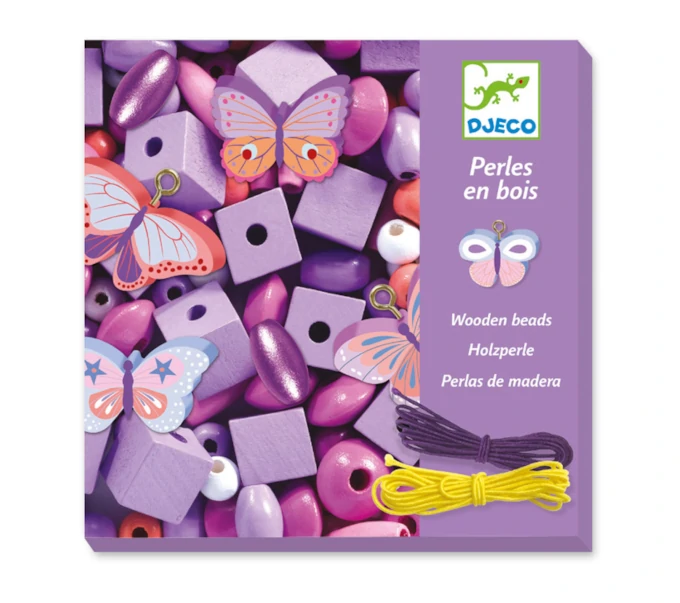 Ξύλινες χάντρες και πεταλούδες από την εταιρεία Djeco, συγκεντρωμένα σε όμορφη συσκευασία για να κατασκευάσεις κοσμήματα σύμφωνα με το στυλ σου!