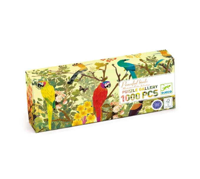 Ένα εντυπωσιακό παζλ 1000 κομματιών από την εταιρεία Djeco, που προσκαλεί μικρούς και μεγάλους σε ένα ήρεμο ταξίδι στον κόσμο των πουλιών, μέσα από μια καλλιτεχνική και γεμάτη λεπτομέρειες εικονογράφηση. Το ιδιαίτερο, μακρόστενο format της σειράς Gallery μετατρέπει το παζλ σε ένα ολοκληρωμένο έργο τέχνης, δίνοντας έμφαση στη ροή της εικόνας και στη συνολική αισθητική εμπειρία. Κατά τη διάρκεια της συναρμολόγησης, ενισχύεται η συγκέντρωση και η υπομονή, ενώ τα παιδιά και οι ενήλικες εξασκούν τη λογική σκέψη και την επίλυση προβλημάτων.
