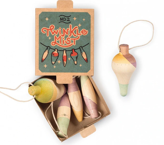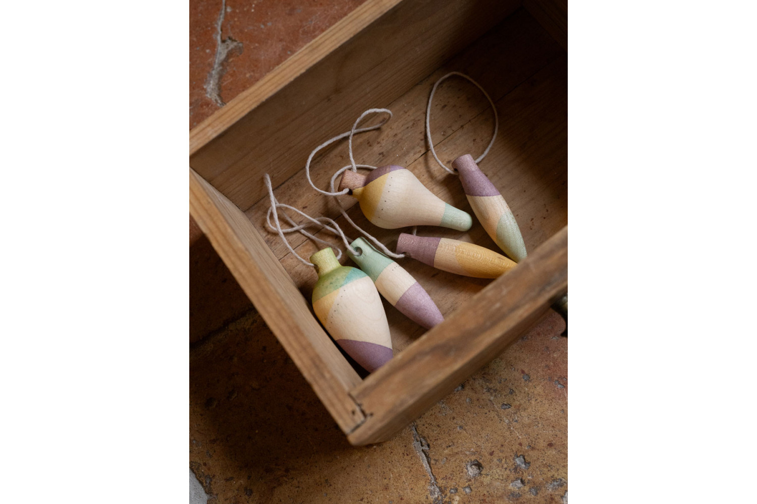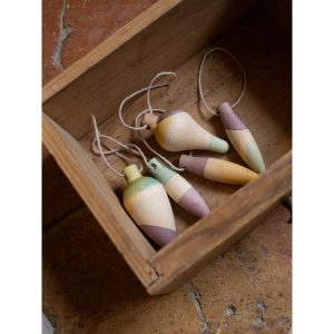 Το κουτί περιλαμβάνει 5 ξύλινα στολίδια με 3 διαφορετικά σχήματα, ζωγραφισμένα στο χέρι (περιλαμβάνεται κορδόνι για να κρεμαστεί)