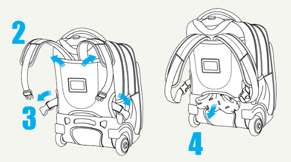 - Για πιο γρήγορη μετατροπή της τσάντας σε τρόλεϊ, μπορείτε να βάλετε τους ιμάντες μέσα στη θήκη πλάτης χωρίς να ξεκουμπώσετε τα κλιπ.