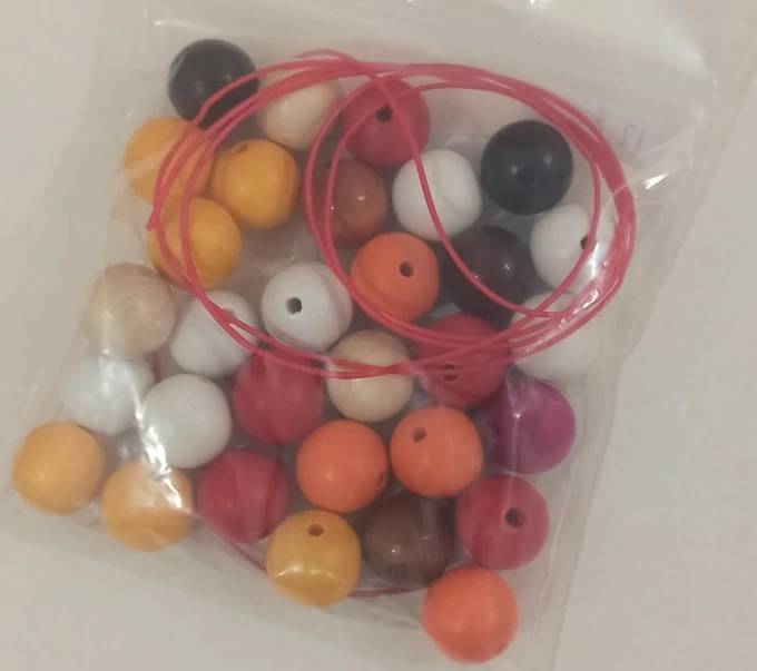 Η συσκευασία περιλαμβάνει 30 χάντρες σε άσπρο, μαύρο, καφέ, πορτοκαλί, κόκκινο, κίτρινο χρώμα και κόκκινο σκοινί.
